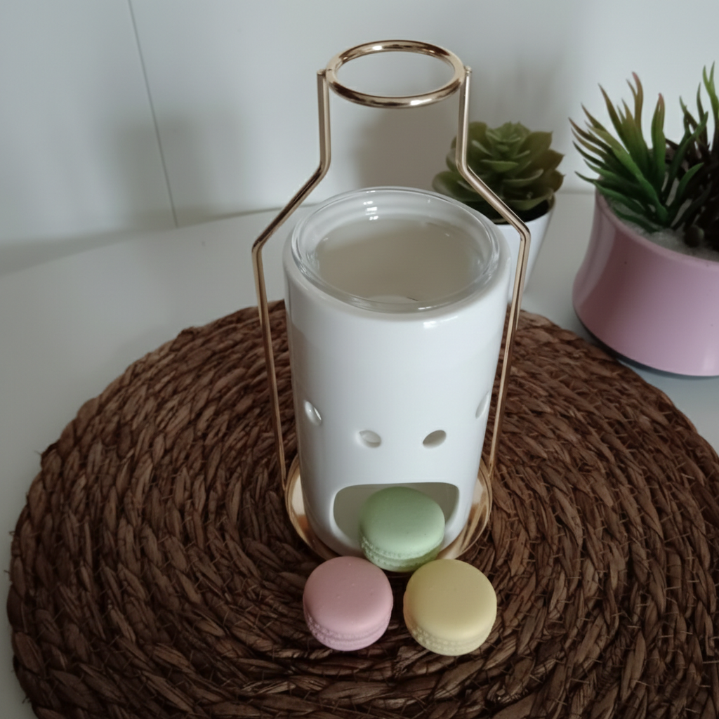 Brûle-parfum Una au design moderne et épuré, en céramique blanche avec anse dorée, idéal pour diffuser fondants ou huiles et apporter une touche élégante à votre intérieur.